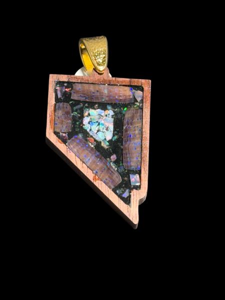 Beautiful Nevada State Stone, black and crystal opal with conk wood pendant. Uniquely designed by Orca Gems to be one of a kind keepsake. A resin filled mold surrounded by wood or Sterling Silver then capped with a clear quartz. Each one meticulously hand set. Introductory price!