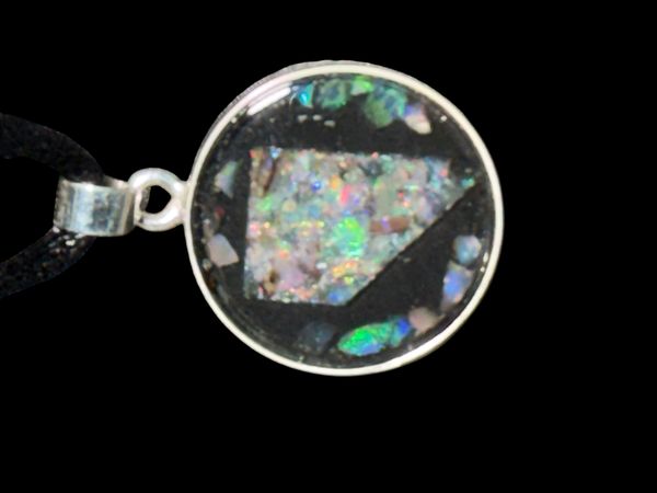 Beautiful Nevada State Stone, black and crystal opal set in sterling silver pendant. Uniquely designed by Orca Gems, with Stones sourced in the Virgin Valley Opal Mines, to be one of a kind keepsake. A resin filled mold surrounded by wood or Sterling Silver then capped with a clear quartz. Each one meticulously hand set. Introductory price!