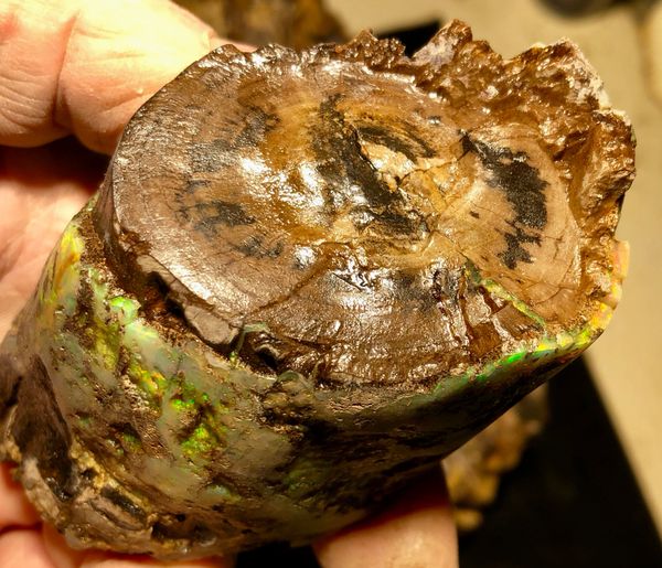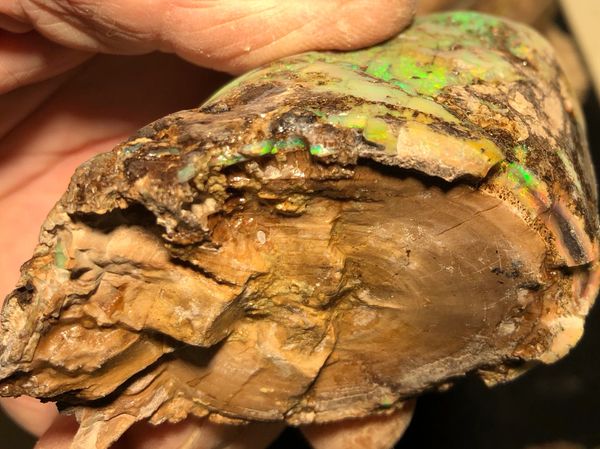 Big Approximately 40 cm long and 6cm in diameter. This 14 million year old piece was mined at Bonanza Opal Mine in 2016. It has amazing PRECIOUS OPAL Along the outside and under the bark penetrating inside. Great details of knots and grain and the large end has the Ancient Ash matrix holding on to other sticks and pieces ( can be removed but adds to the interest!). It also has a small piece of a limb that was sitting on top of the branch when mined and fits into the hole in the bark. Precious opal shines from the end, the bark and across the top. Can be glued back in but a separate piece now. 4 PIECES OF MAGNIFICENT OPAL IN WOOD. VERY RARE FIND.