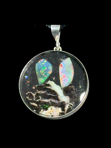Beautiful 30mm Nevada State Stone, black and crystal opals set in sterling silver pendant. Uniquely designed by Orca Gems, with Stones sourced in the Virgin Valley Opal Mines, to be one of a kind keepsake. A resin filled mold surrounded by wood or Sterling Silver then capped with a clear quartz. Each one meticulously hand set. Introductory price!