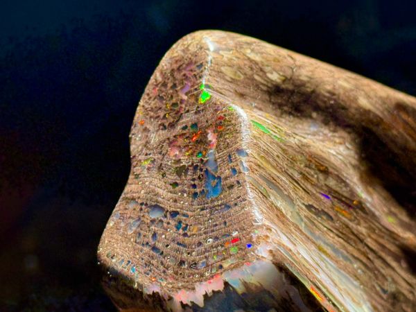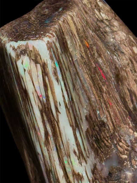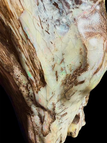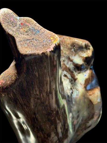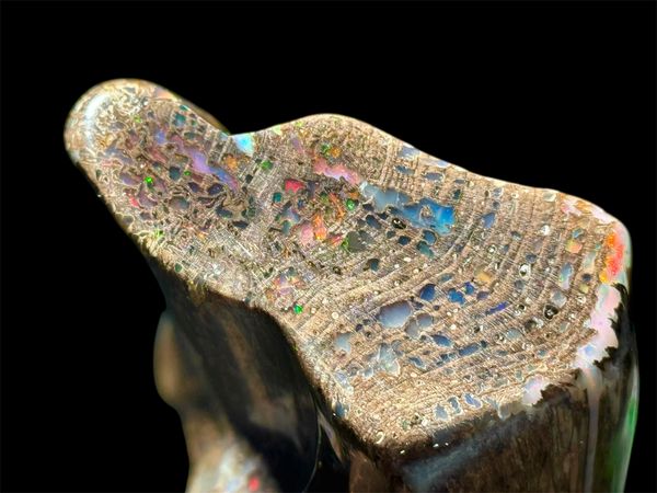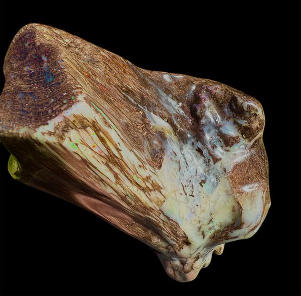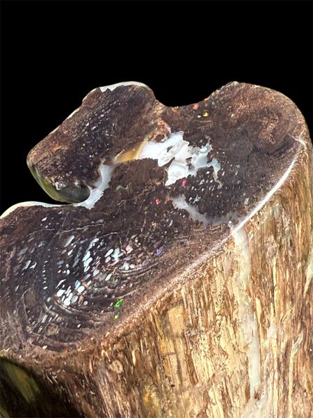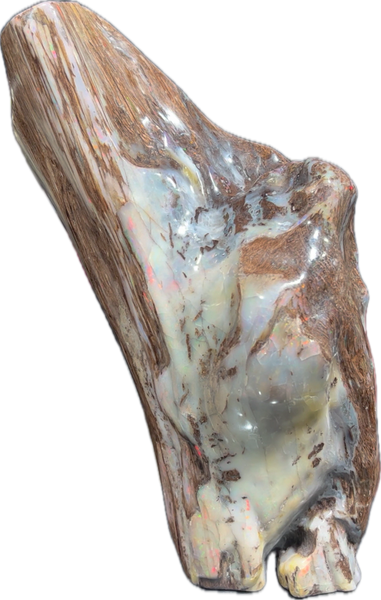 The holy grail of finds! One of the largest full Conk pieces mined at the Bonanza Opal Mine in the Virgin Valley.Conk wood with opal is sought after and highly desirable due to its Rare and Beautiful structure. A tree attacked by the Conk fungus( a conifer in the Fir category most likely) which hollowed out the cells. It then was buried deep in an ancient lakebed, petrified and then opalized with amazing precious opal!. Found in 2008 by Ray Wood and prepped by Andy Mangold, 450 hours of hand work, to clean and preserve this specimen to Museum Quality. Measuring 11” high x 5” wide at its maximum it weighs about 1/2 lb or 0.19kg.
