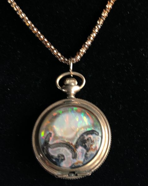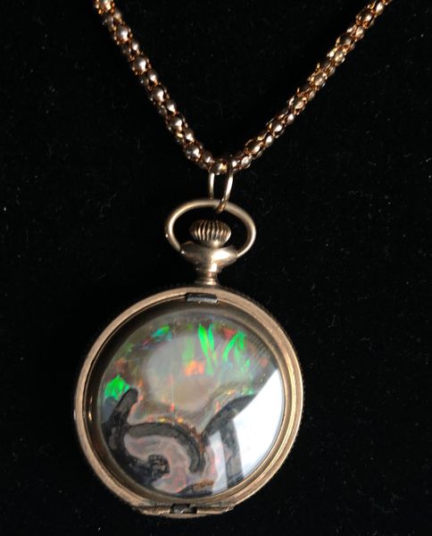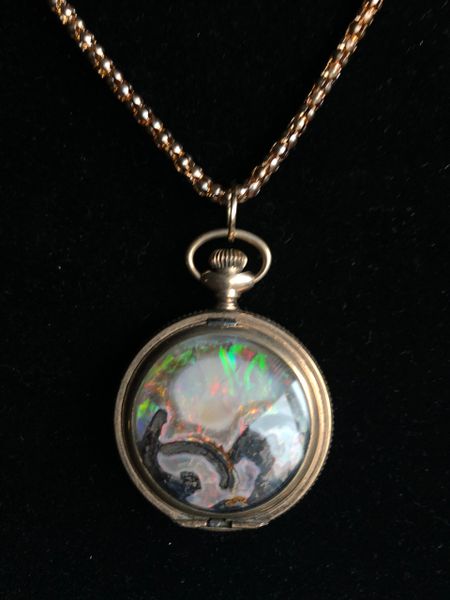 Beautiful 3cm diameter Black Crystal opal Limb slice in a repurposed vintage railroad watch case. Timeless Treasure wher we remove the time movement and add a one of a kind treasure - Dry stable Black Crystal opal limb slice with wood features! It even has a ghost with fire. Everything you need to show off your love of Virgin Valley Opals in a one of a kind Treasure.