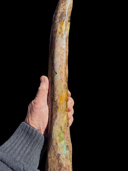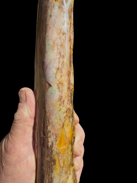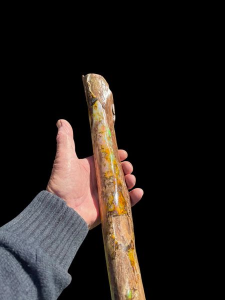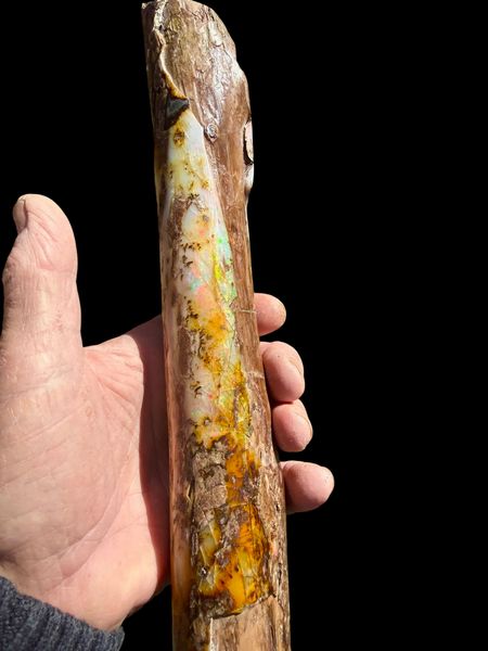 This is a beautiful example of what Virgin Valley offers the serious collector! approximately 16” x 3” x 2” (40cm x 6cm x 4 cm) and weighing 1lb 14 oz (.88kg). A full round branch buried in 14 million year old clay lake bed the the outside opalized with precious opal. the wood is most likely a Sequoia variety which was prevalent in the area at the time. Cleaned , the wood stabilized ,and opal polished this would be a stand out specimen for any collection.